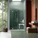 Mezzo box doccia ad angolo, piatto doccia filo pavimento idoneo per disabili o anziani con seggiolino doccia a ribalta e ausili
